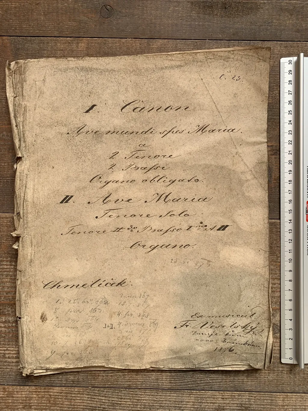 I. Canon | Ave mundi spes Maria a | 2 Tenore | 2 Bassi | Organo obligato | II. Ave Maria | Tenore Solo | Tenore II^do Basso I^mo A II | Organo I Chmelíček | Ex musical Fr. Veselský | Daruje kůru | novo Knínskému | 1876