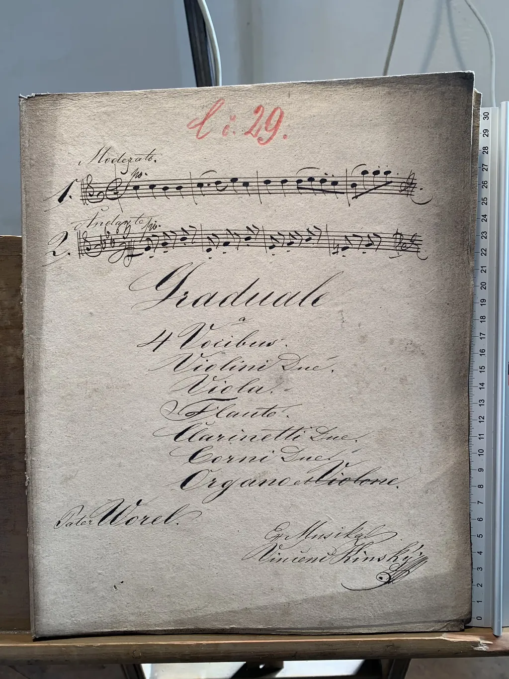 Graduale | a | 4 Vocibus, | Violini Due, | Viola, | Flauto, | Clarinetti Due | Corni Due | Organo et Violone | Pater Worel | Ex Musikal | Vincenc Kinský MP