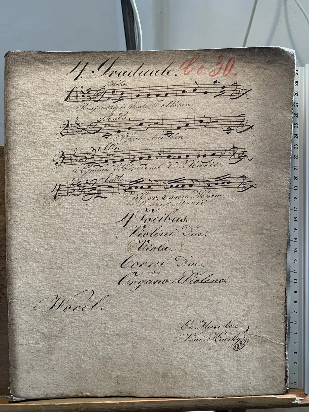 4. Graduale. | 1. K nejsvětější svátosti oltářní | 2. V prosební den | 3. K jménu p. Ježíše neb k P. Marii. | 4. K sv. Jánu Nepom. | neb k Paně marii | 4 Vocibus. | Violini Due. | Viola. | Corni Due. | con | Organo et Violone | Worel. | Ex Musikal | Vinc. Kinský