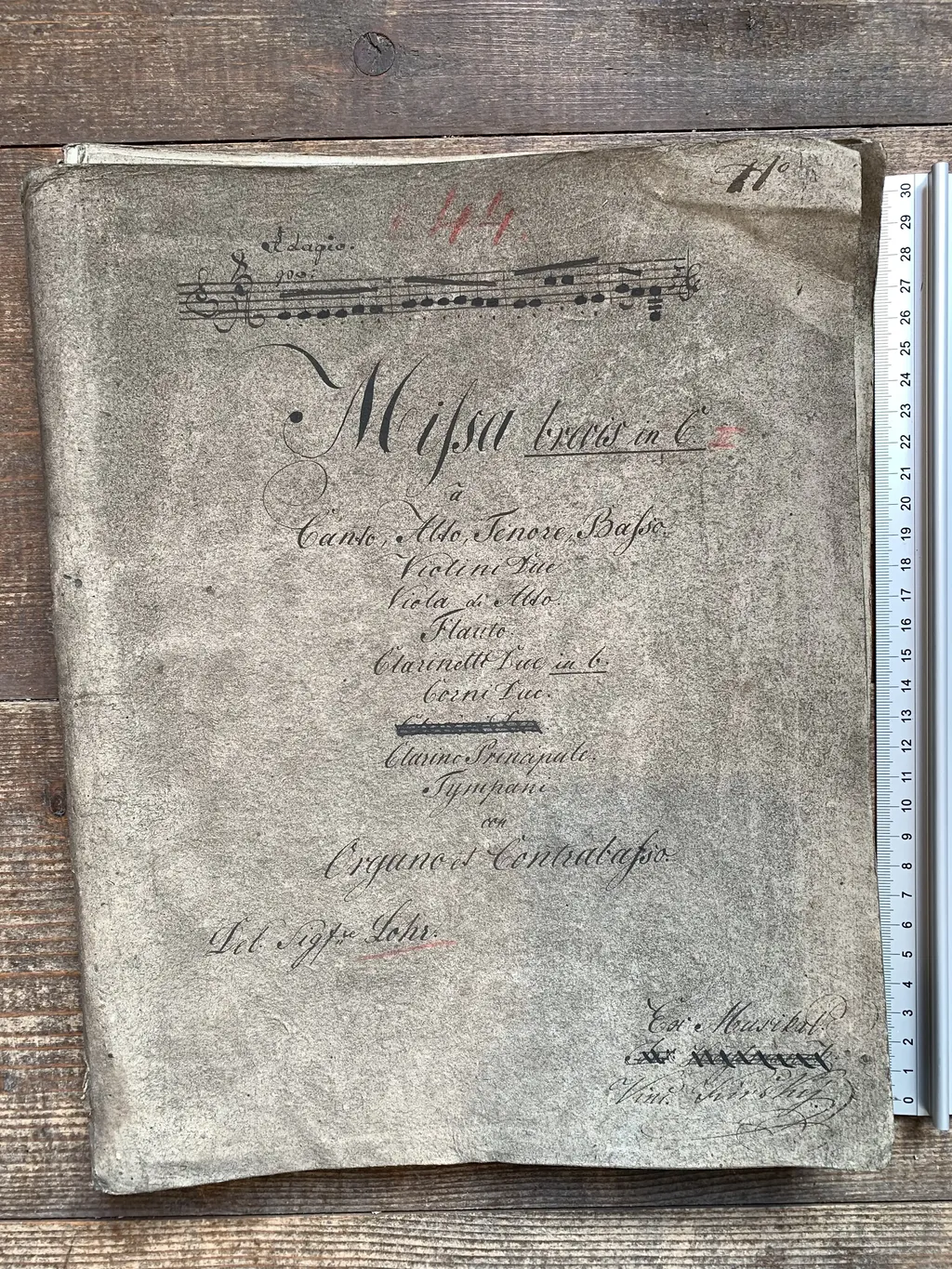 Missa brevis in C | a | Canto, Alto, Tenore, Basso | Violini Due | Viola di Alto | Flauto| Clarinetti Due in b | Corni Due | Clarino Principale | Timpani | con | Organo et Contrabasso | Del Sig^re Lohr