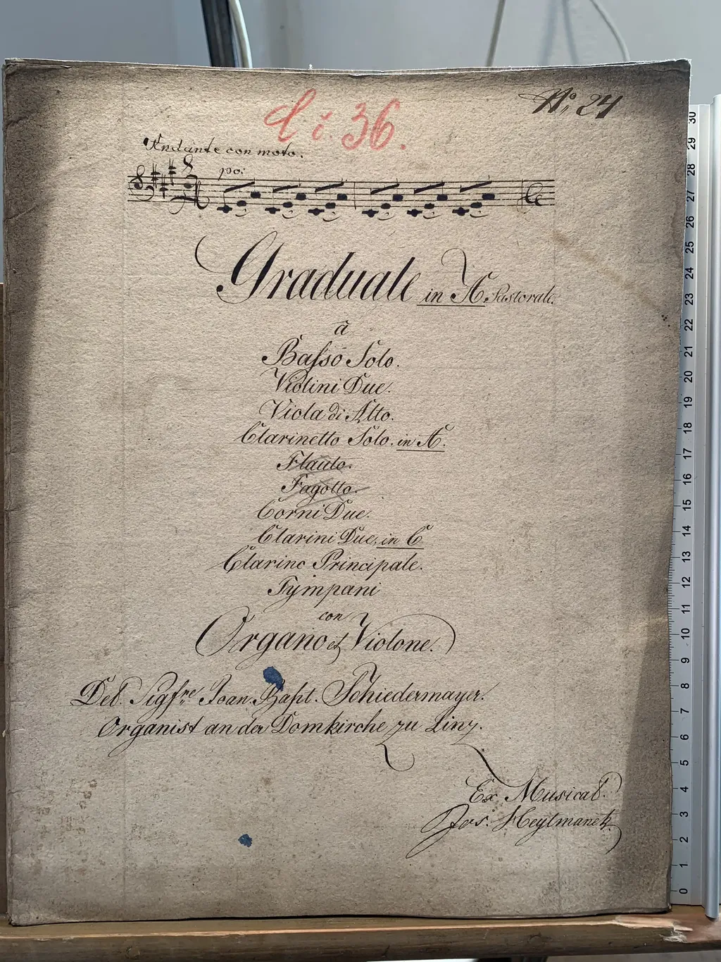 H:24 | Graduale in A Pastorale | a | Basso Solo. | Violini Due | Viola di Alto. | Clarinetto Solo in A. | [přeškrtáno]Flauto. | [přeškrtáno]Fagotto. | Corni Due | Clarini Due in C | Clarino Principale | Tympani | con | Organo et Violone. | Del Dig^re Joan. Bapt. Schiedermayer | Organist an der Domkirche zu Linz | Ex Musical.| Jos. Heytmanek