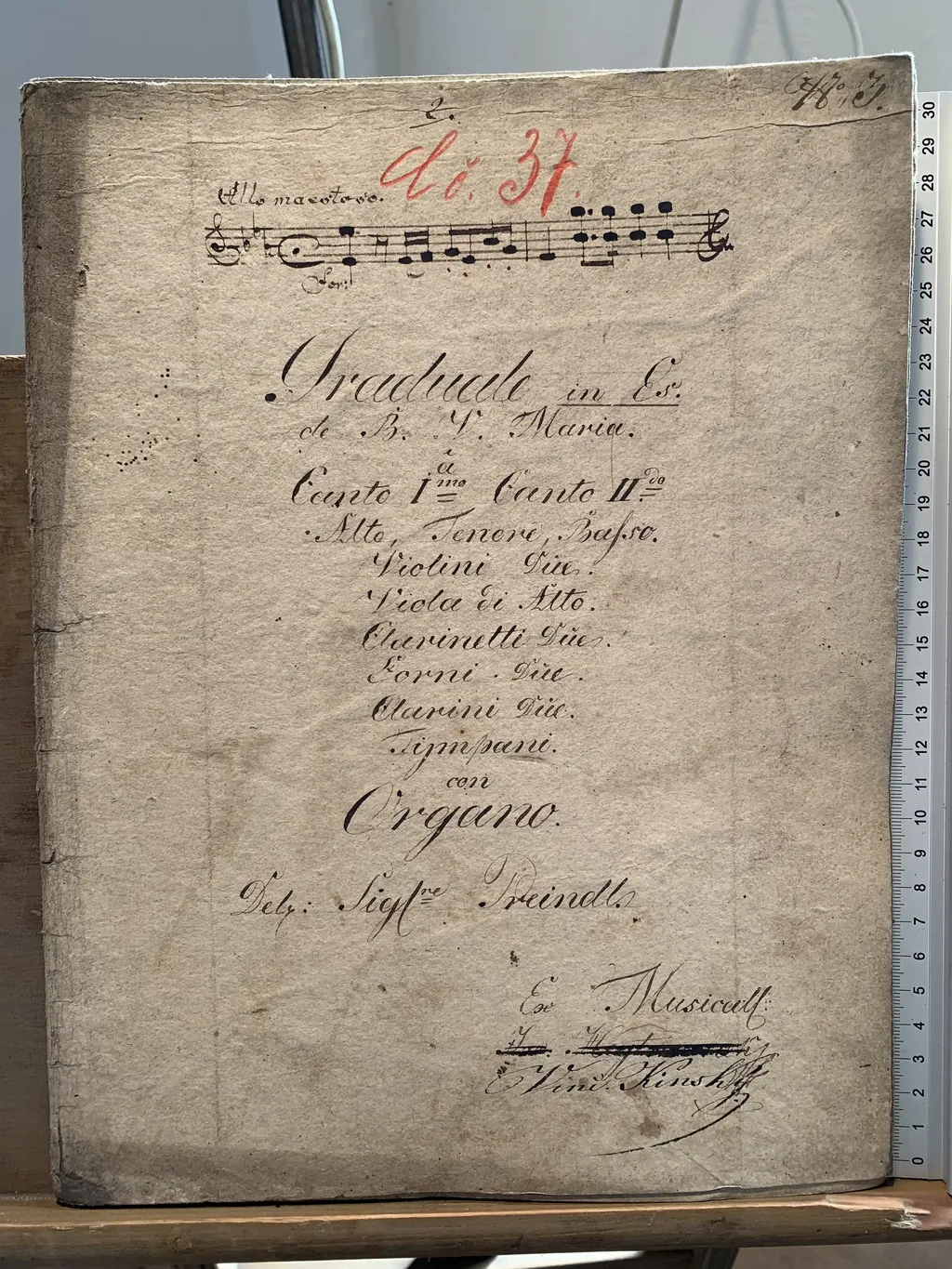 2. H: 3 | Graduale in Es | de B. W. Maria. | a | Canto I~mo Canto II^do | Alto, Tenore, Basso | Violini Due. | Viola di Alto. | Clarinetti Due. | Corni Due. | Tympani. | con | Organo | Del: Sig^re Prindl | Ex Musical | Vinc. Kinský MP