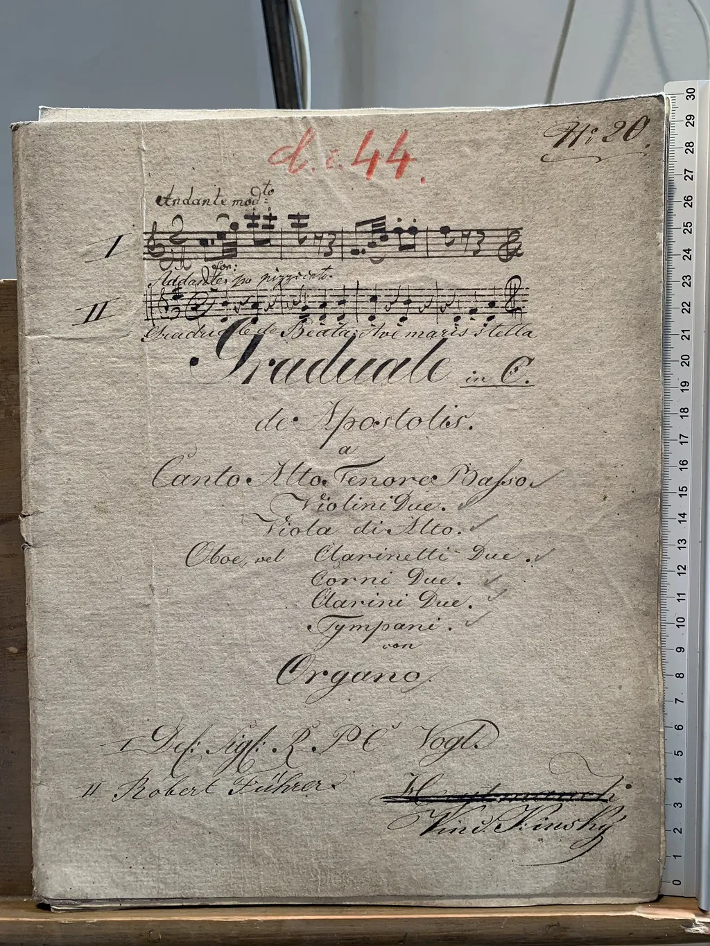 Graduale in C. | de Apostolis. | a | Canto. Alto. Tenore. Basso. | Violini Due. | Viola di Alto. | Oboe, ??? Clarinetti Due. | Corni Due. | Tympani. | con | Organo | I Del Sig: R=P=Č Vogl | II Robert Führer | Vinc. Kinský