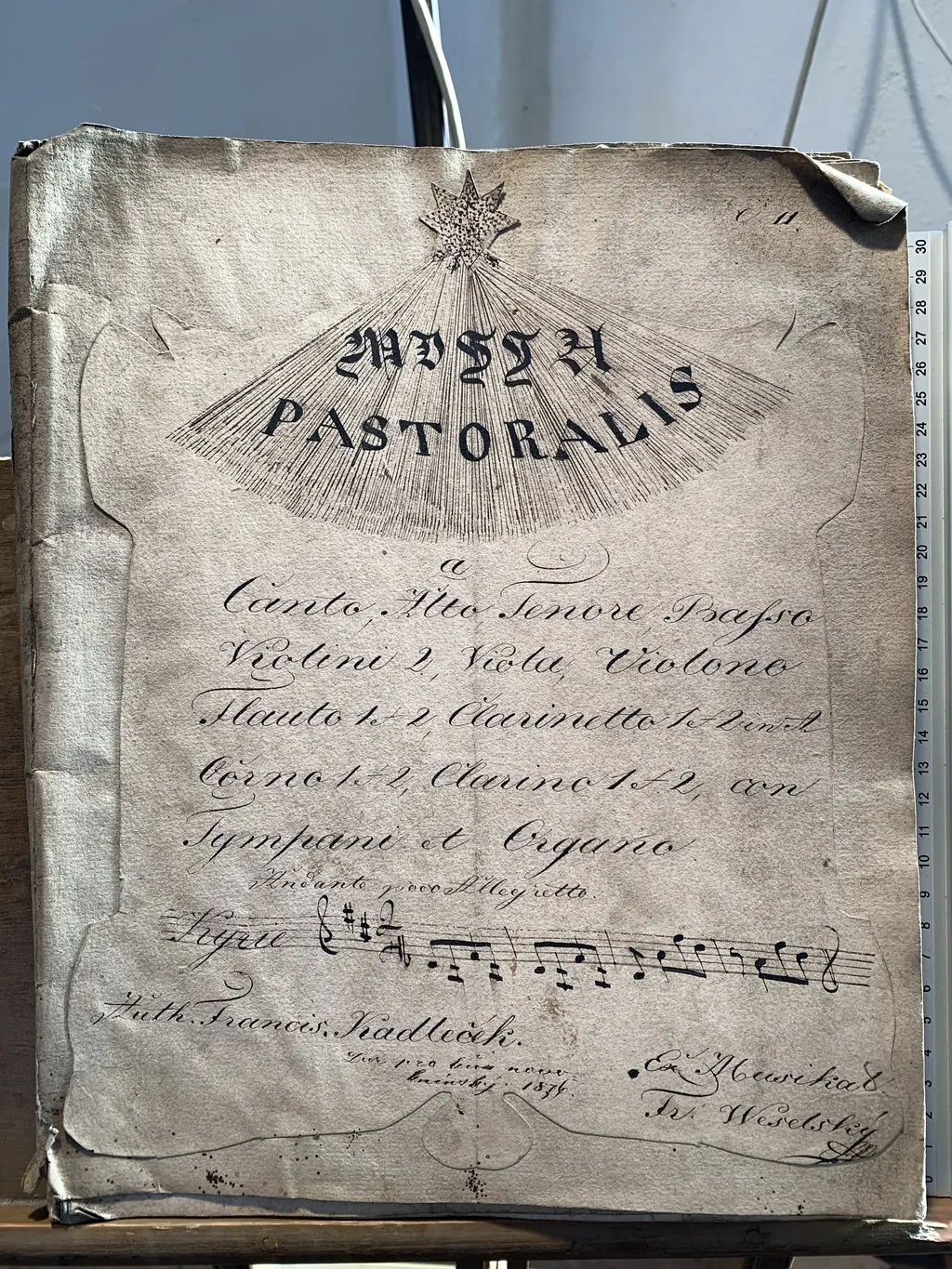 Missa Pastoralis | a | Canto, Alto, Tenore, Basso | Violini 2, Viola, Violone | Flauto 1 et 2, Clarinetto 1 et 2 in A | Corno 1 et 2, Clarino 1 et 2, con| Tympani et Organo | Auth. Francis. Kadleček. | dar pro kůr novo | knínský 1876 | Ex Musikal | Fr. Weselský MP