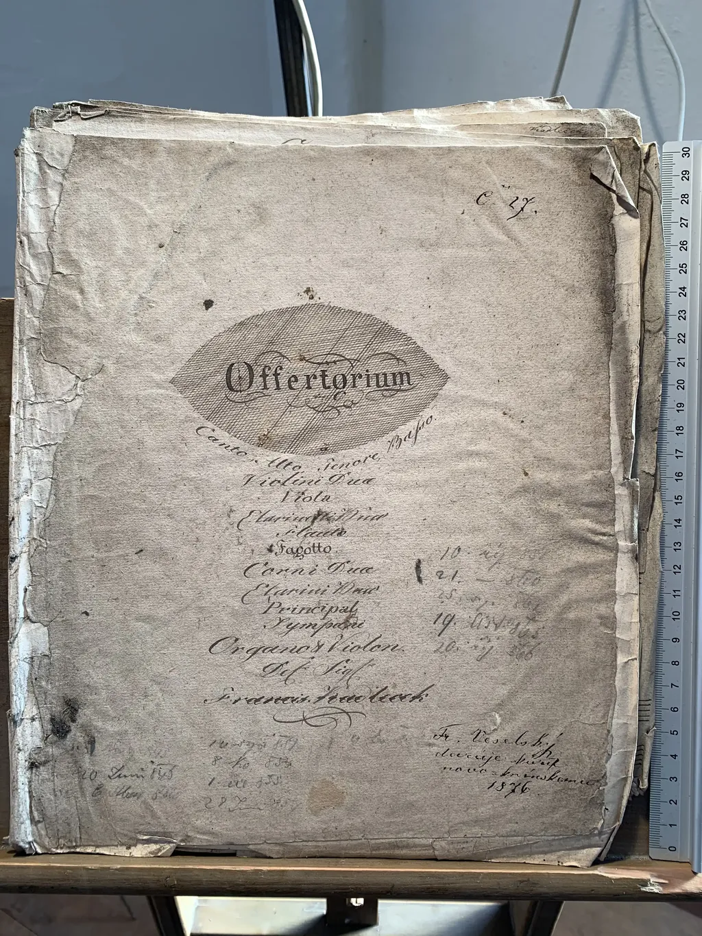Offertorium | Canto, Alto, Tenore, Basso | Violini Due | VIola | Clarinetti Due | Flauto | Fagotto | Corni Due | Clarini Due | Principal | Tympani | Organo et Violon. | Del sign^re | Francis Kadlecek | Fr. Veselský | daruje kůru | novo = knínskému | 1876