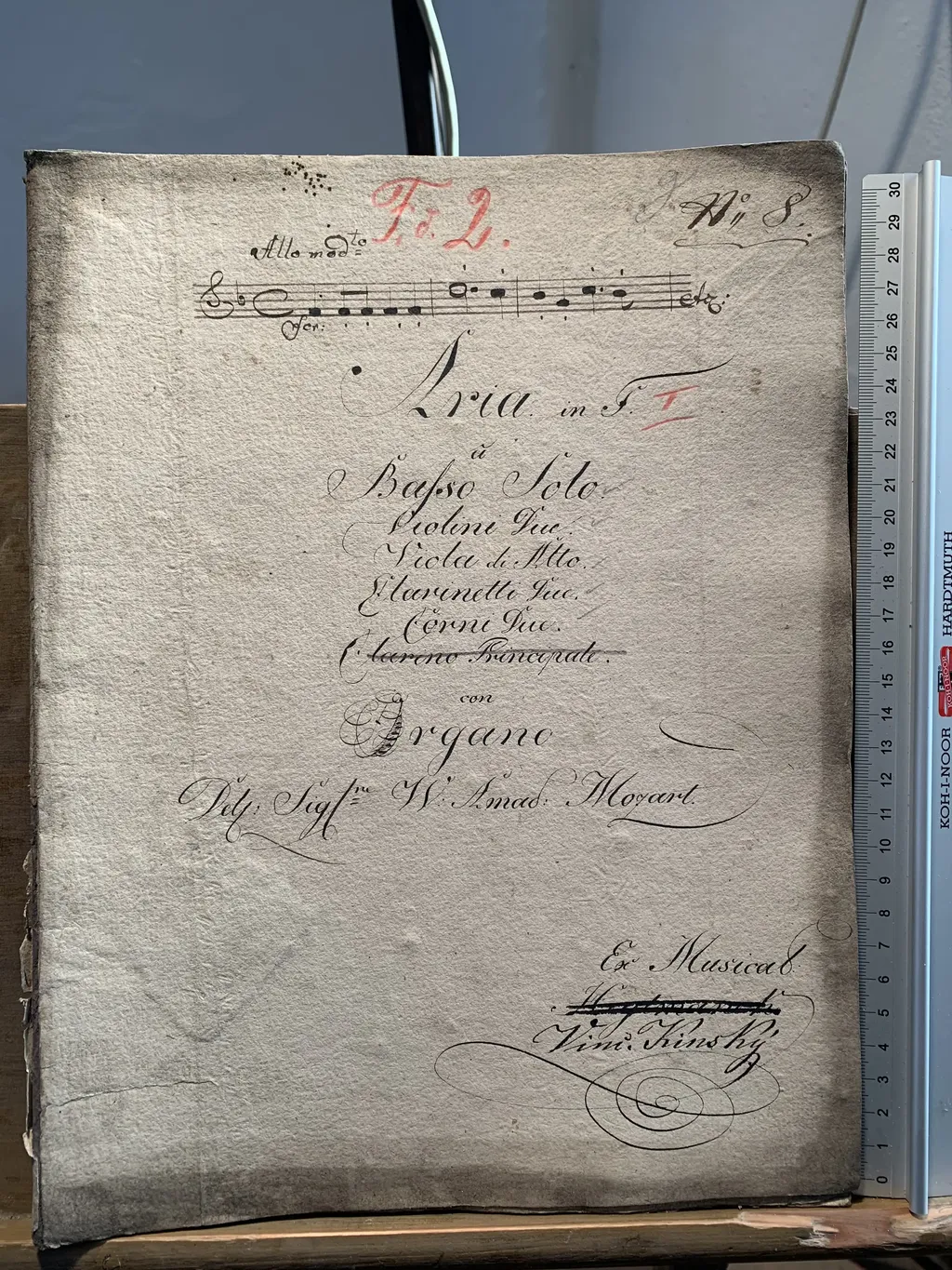 Aria in F [1] | a | Basso Solo | Violini Due | Viola di Alto | Clarinetti Due | Corni Due | [Clarino Principale] | con | Organo | Del Sigl^re W. Amad: Mozart | Ex Musical | [Heytmanek] | Vinc. Kinský