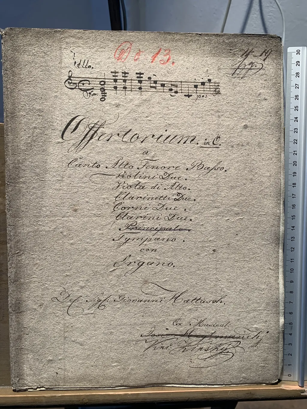 Offertorium in C | a | Canto, Alto, Tenore, Basso. | Violini Due. | Viola di Alto. | Clarinetti Due. | Corni Due. | Clarini Due. | Principale. | Tympano. | con | Organo | Del. Sigl: Giovanni Mattasek. | Ex. Musical: | Vinc. Kinský