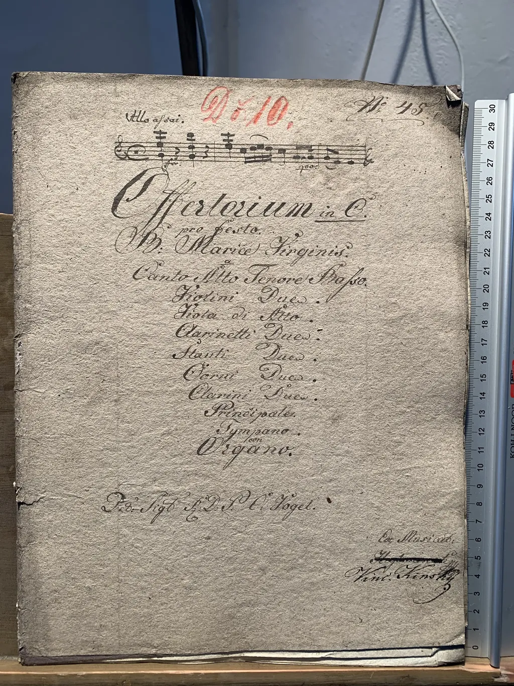 Offertorium in C. | pro festo | B. Marie Virginis | a | Canto, Alto, Tenore, Basso. | Violini Due. | Viola di Alto. | Clarinetti Due. | Flauti Due. | Corni Due. | Clarini Due. | Principale. | Tympano. | con | Organo. | Del Sigl. R. D. P. C Vogel. | Ex Musical: | Vinc. Kinský MP